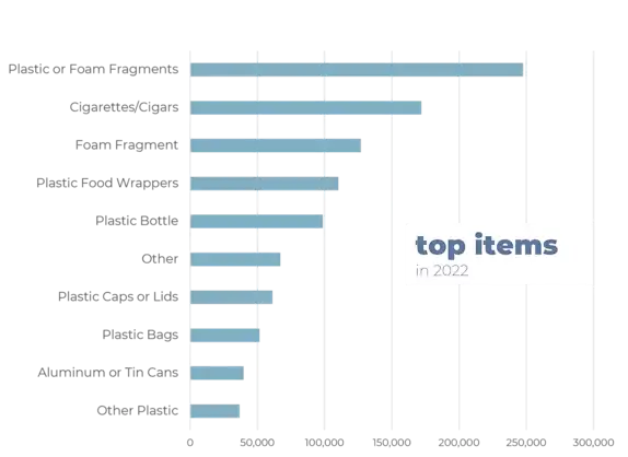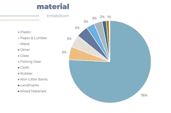 It does not come as a surprise that plastic once again tops the list of materials, comprising 76% of the total dataset. Top items included plastic and foam fragments, cigarettes, and plastic food wrappers. Recyclable items like plastic bottles and aluminum cans were still in the top 10 litter items.