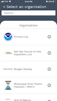 Once you've created an account, you will need to select an existing organization list to track with. Each organization on Debris Tracker has a list of debris items you can use to track and quantify the items you find along your Debris Tracker journey. These may be items such as plastic bags, cigarette butts, plastic fragments, fishing gear, and others. Different organizations may have unique items on their lists, based on specific research questions they are investigating, the trash they are finding in their cleanups, or the language or dialect that is best for their volunteers. Many lists are widely used and appropriate for most users.